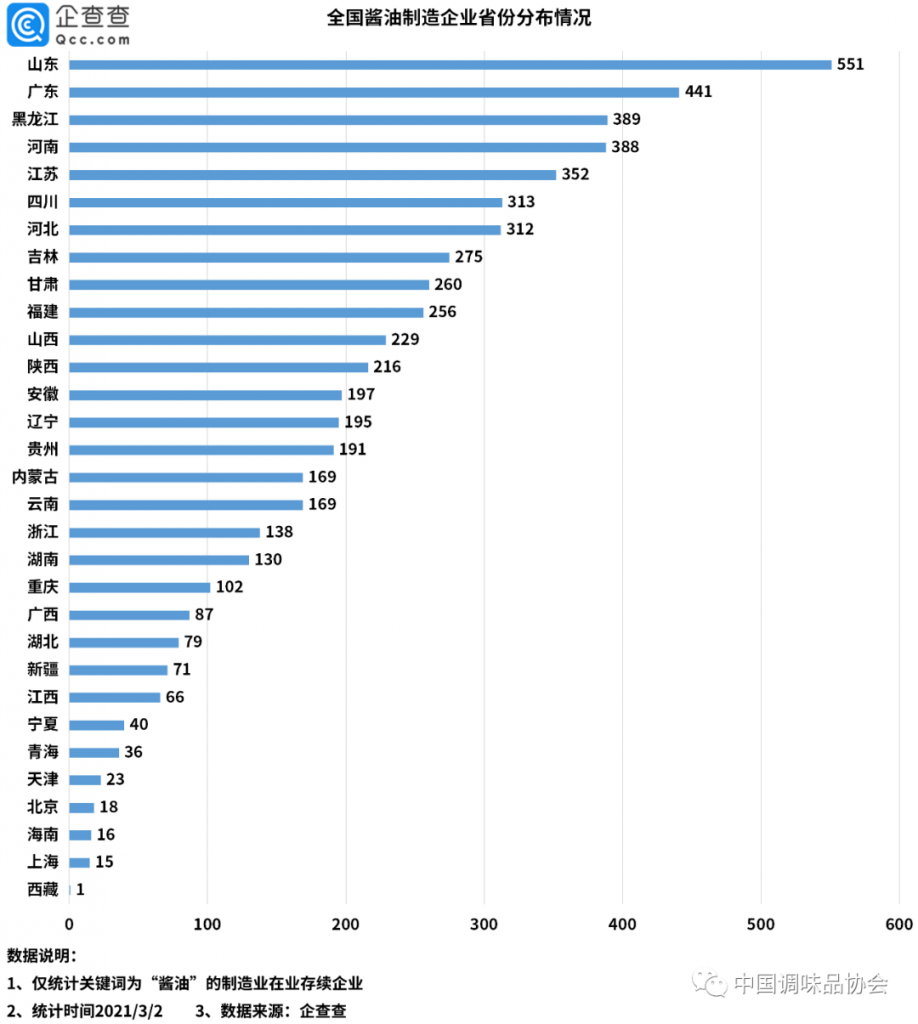 ? ? ? 醬油制造企業省份分布上,山東省擁有的醬油制造企業最多,達551家,廣東、黑龍江次之。