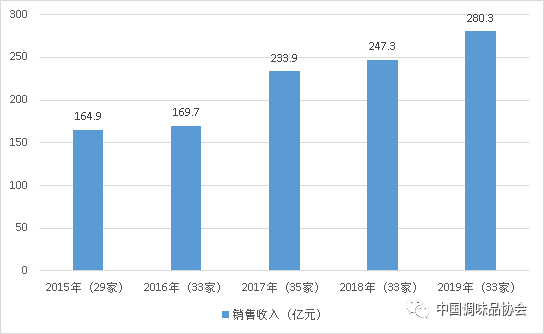 ? ? ? 2015-2019年百強企業醬油產業銷售收入分別為:164.9億元、169.7億元、233.9億元、247.3億元、280.3億元。