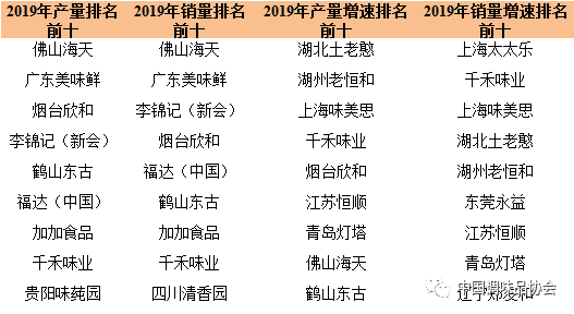 ? ? ? 中國著名品牌企業100強數據統計顯示,2019年醬油產量排名前五的企業分別為佛山市海天調味食品股份有限公司、廣東美味鮮調味食品有限公司、煙臺欣和 企業食品有限公司、李錦記(新會)食品有限公司、鶴山市東古調味食品有限公司,銷售收入前五的企業分別為佛山市海天調味食品股份有限公司、廣東美味 鮮調味食品有限公司、李錦記(新會)食品有限公司、煙臺欣和企業食品有限公司、福達(中國)投資有限公司。2019年百強企業醬油產量排名前十企業中, 100%呈現正向增長;銷售收入排名前十企業中,90%呈現正向增長。