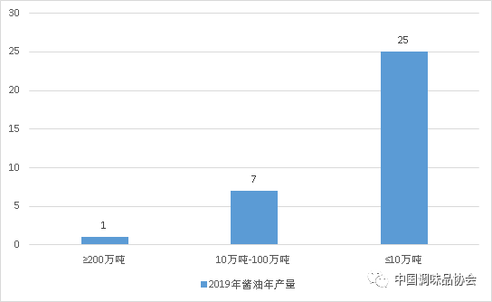 ? ? ? 中國著名品牌企業100強數據統計顯示,2019年百強企業中醬油產量分布呈現金字塔狀。年產量超過100萬噸有1家,10-100萬噸有7家,10萬噸以下有25家。