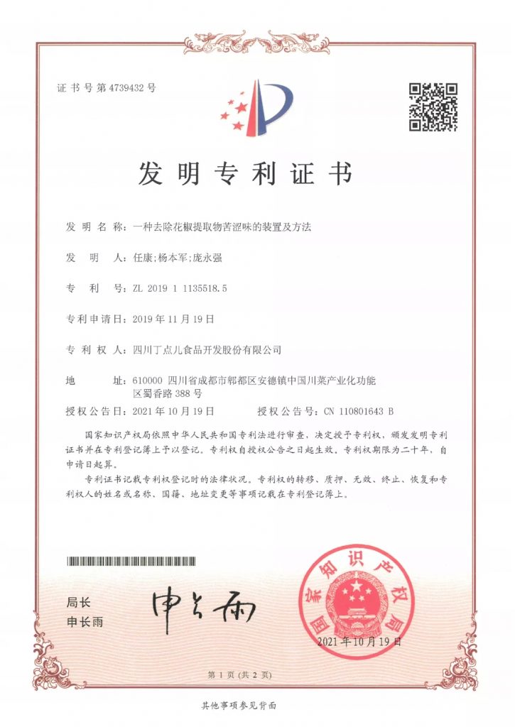 ? ? ? ?近日,丁點兒股份創新研發出《一種去除花椒提取物苦澀味的裝置及方法》并獲得國家發明專利授權,這是公司在花椒及花椒制品研究方面取得的第4項國家發明專利。