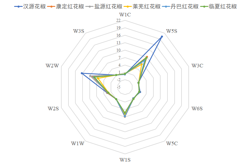 電子鼻技術設備簡單,容易攜帶,操作簡便,是較成熟的風味分析技術,在食品分析中應用廣泛。劉振平博士運用電子鼻技術對漢源花椒及與漢源花椒外觀顏色、顆粒大小類似,從表面難以區分且常用于冒充或摻假的不同產地的紅花椒進行了10個傳感器通道的風味成分測定和分析(圖1),用于漢源花椒的鑒別。
