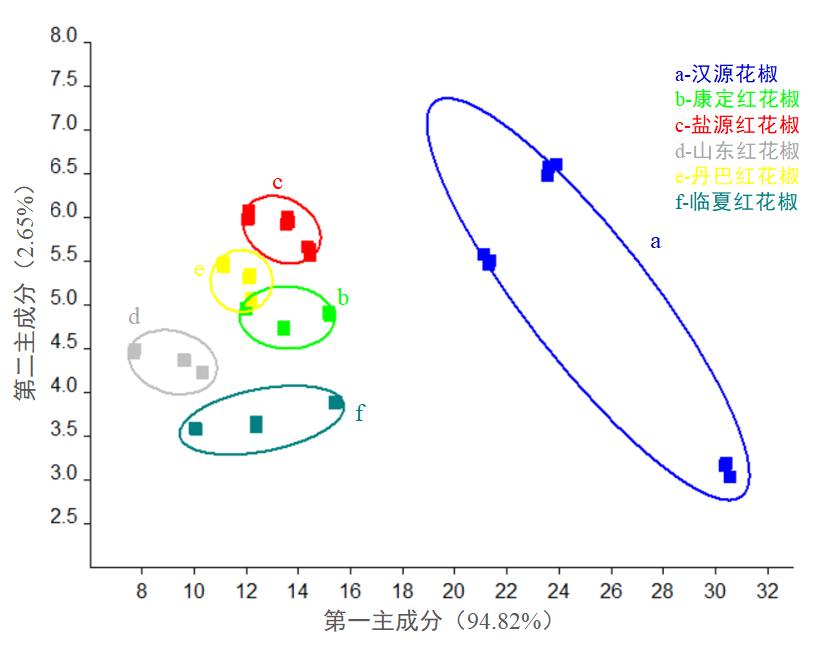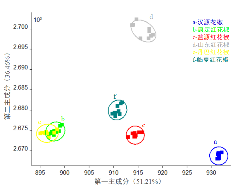 圖2:電子鼻傳感器對不同產地紅花椒響應數據的PCA 得分圖