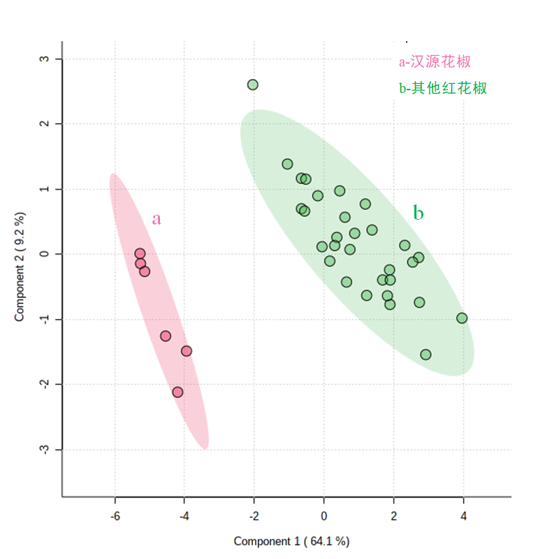 圖4:漢源花椒與其他產地紅花椒鑒別 PLS-DA 得分圖