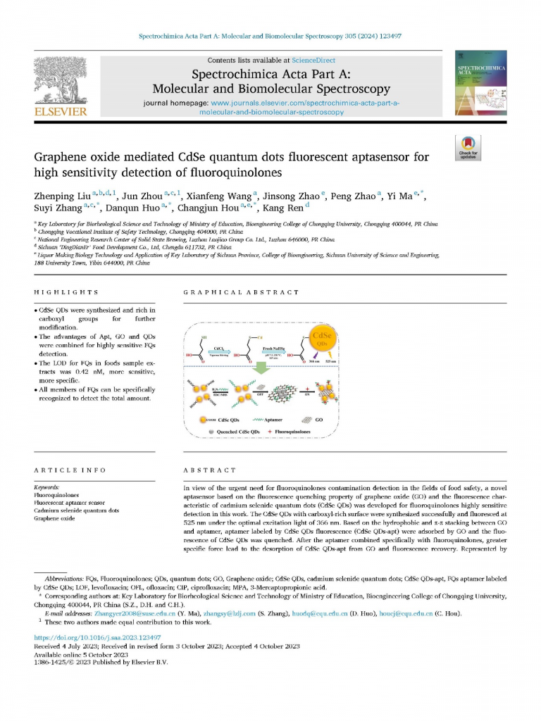 同樣是近日,由丁點兒股份董事長任康和企業(yè)發(fā)展顧問劉振平博士共同署名,與重慶大學(xué)等單位共同完成的基于量子點的創(chuàng)新技術(shù)成果《Graphene Oxide mediated CdSe quantum dots fluorescent aptasensor for high sensitivity detection of fluoroquinolones》(《氧化石墨烯介導(dǎo)的硒化鎘量子點熒光適配體傳感器對氟喹諾酮類抗生素的高靈敏檢測》【點擊跳轉(zhuǎn)原文】)在國際權(quán)威期刊(JCR Q1區(qū))《Spectrochimica Acta Part A Molecular and Biomolecular Spectroscopy》發(fā)表,國家發(fā)明專利也已公布并進入實質(zhì)審查階段。