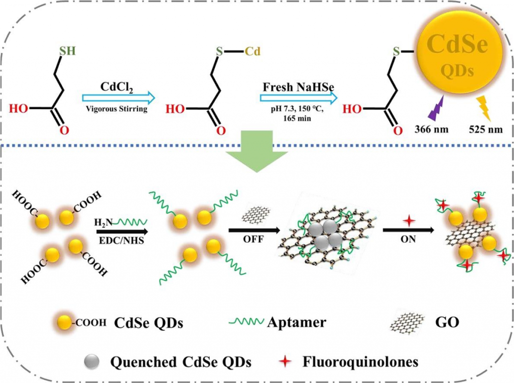 該項成果以3-巰基丙酸(MPA)為穩(wěn)定劑合成了表面易修飾、熒光性質(zhì)穩(wěn)定、水溶性良好的硒化鎘量子點(CdSe QDs),并將核酸適配體(Apt)的特異性識別功能、氧化石墨烯(GO)的表面特性和熒光猝滅性質(zhì)與CdSe QDs的特性融合在一起,構(gòu)建了GO介導(dǎo)的、基于CdSe QDs熒光標(biāo)記的適配體傳感體系用于動物食品中氟喹諾酮類抗生素(FQs)殘留的高靈敏檢測方法,達到國際先進水平。