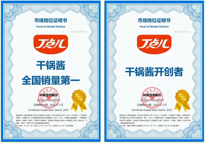 尚普咨詢集團是中國最早成立的專業市場研究公司之一。其通過行業專家和企業調研,對比中國大陸(含22個省、5個自治區、4個直轄市)范圍內,全渠道市場、各干鍋醬產品上市時間與創新情況,從我國干鍋醬行業起源統計至2024年12月31日,得出丁點兒為“干鍋醬開創者”的認證。同時根據全渠道市場,統計了2024年1月1日至2024年12月31日各干鍋醬品牌相關產品銷量情況,得出丁點兒“干鍋醬全國銷量第一”的認證。