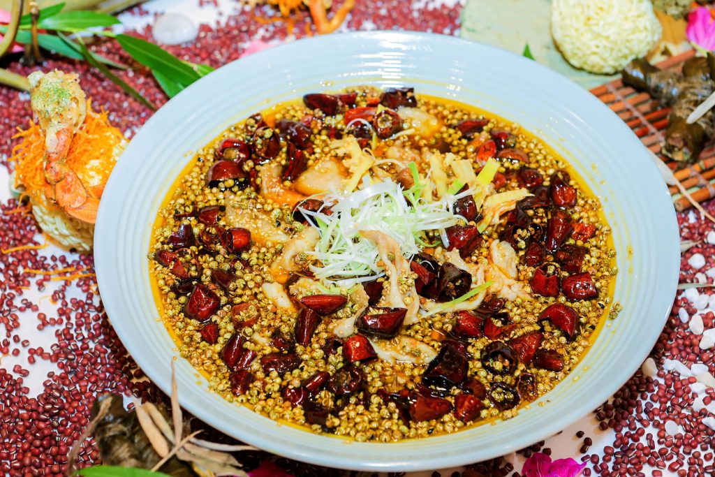 現場,行政總廚李偉、王俊成現場演繹經典川菜創新烹飪技法。用丁點兒椒麻雞汁、藤椒油、青花椒麻辣醬等高品質特色產品創新打造的紅袍尋雙味、清幽九肚魚等特色風味菜品,將椒麻味型展現得淋漓盡致,香氣溢滿整個會場,引得與會嘉賓紛紛前來品鑒交流。