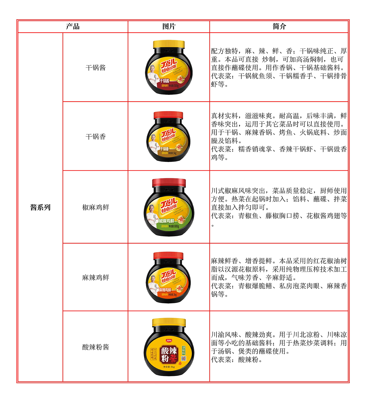公司主要面向餐飲企業(yè)提供標準化、便捷化的川味特色調(diào)味料,主要有川味復(fù)合調(diào)味料、川味特色花椒油兩大類產(chǎn)品。川味復(fù)合調(diào)味料按形態(tài)劃分主要有醬、汁、粉、油四種形態(tài);按口味劃分,圍繞川菜“麻”“辣”“香”的特點,主要有椒麻、麻辣、酸辣、鮮香等多種口味,共計200余種產(chǎn)品。川味特色花椒油主要有漢源紅花椒油、藤椒油等產(chǎn)品。主要產(chǎn)品如下:
